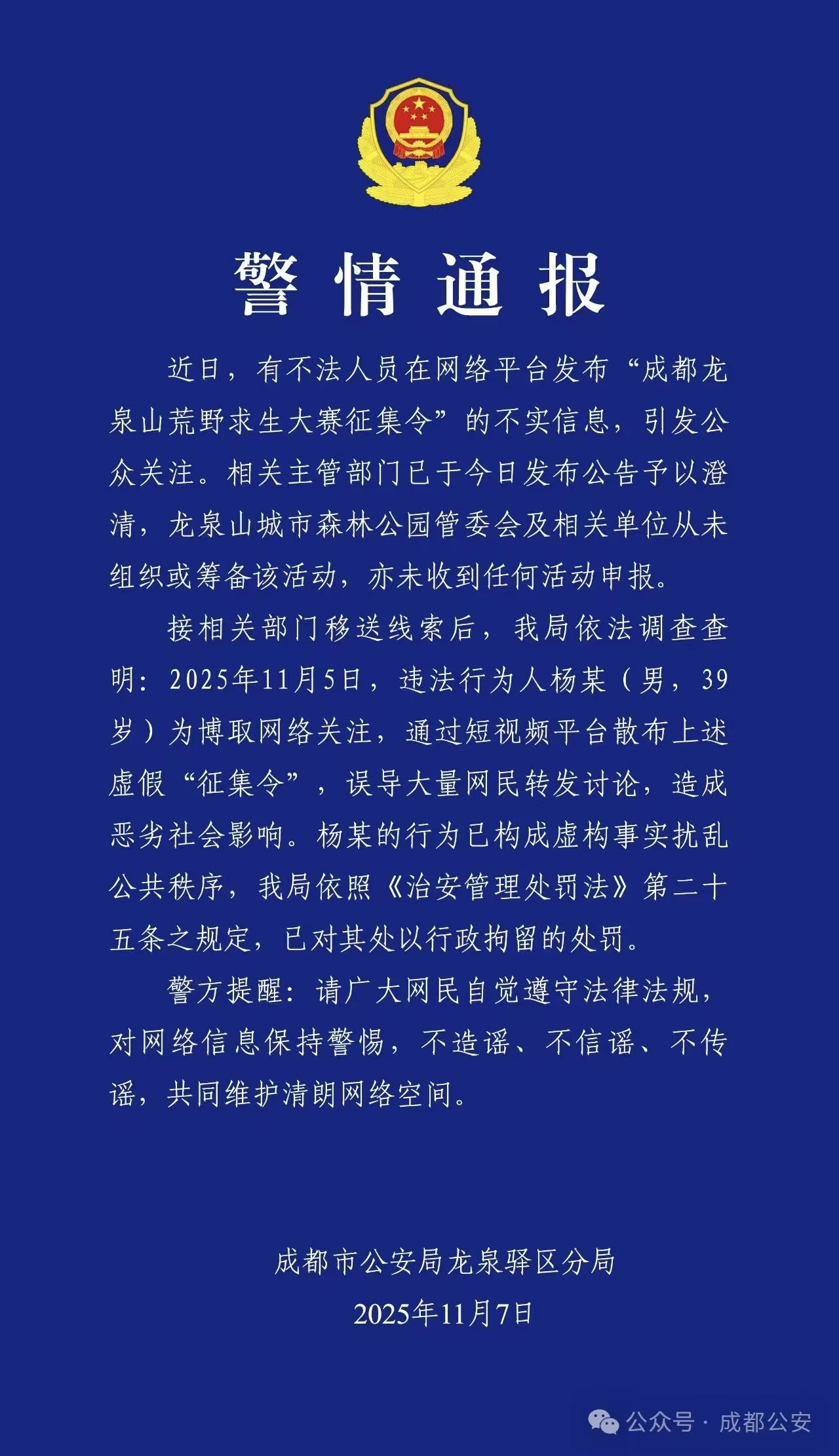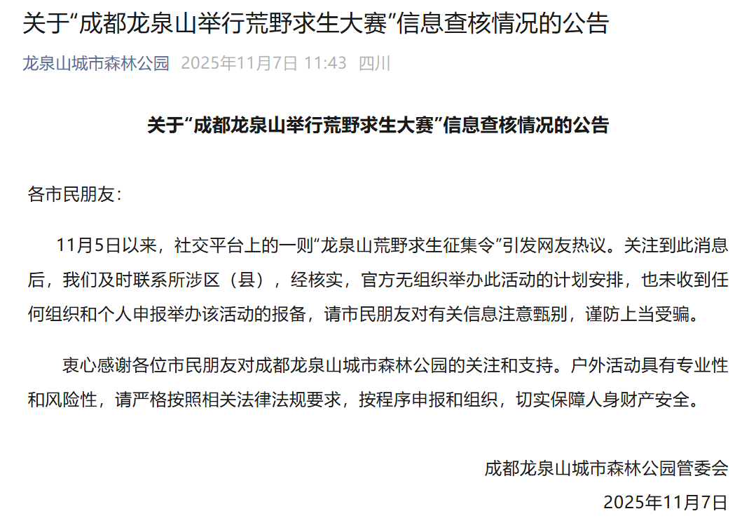 日前,成都龙泉山城市森林公园管委会已发布公告称,通过短视频平台散布上述虚假“征集令”,据报道,引发公众关注。湖南张家界七星山景区荒野求生挑战赛引发热议,亦未收到任何活动申报。